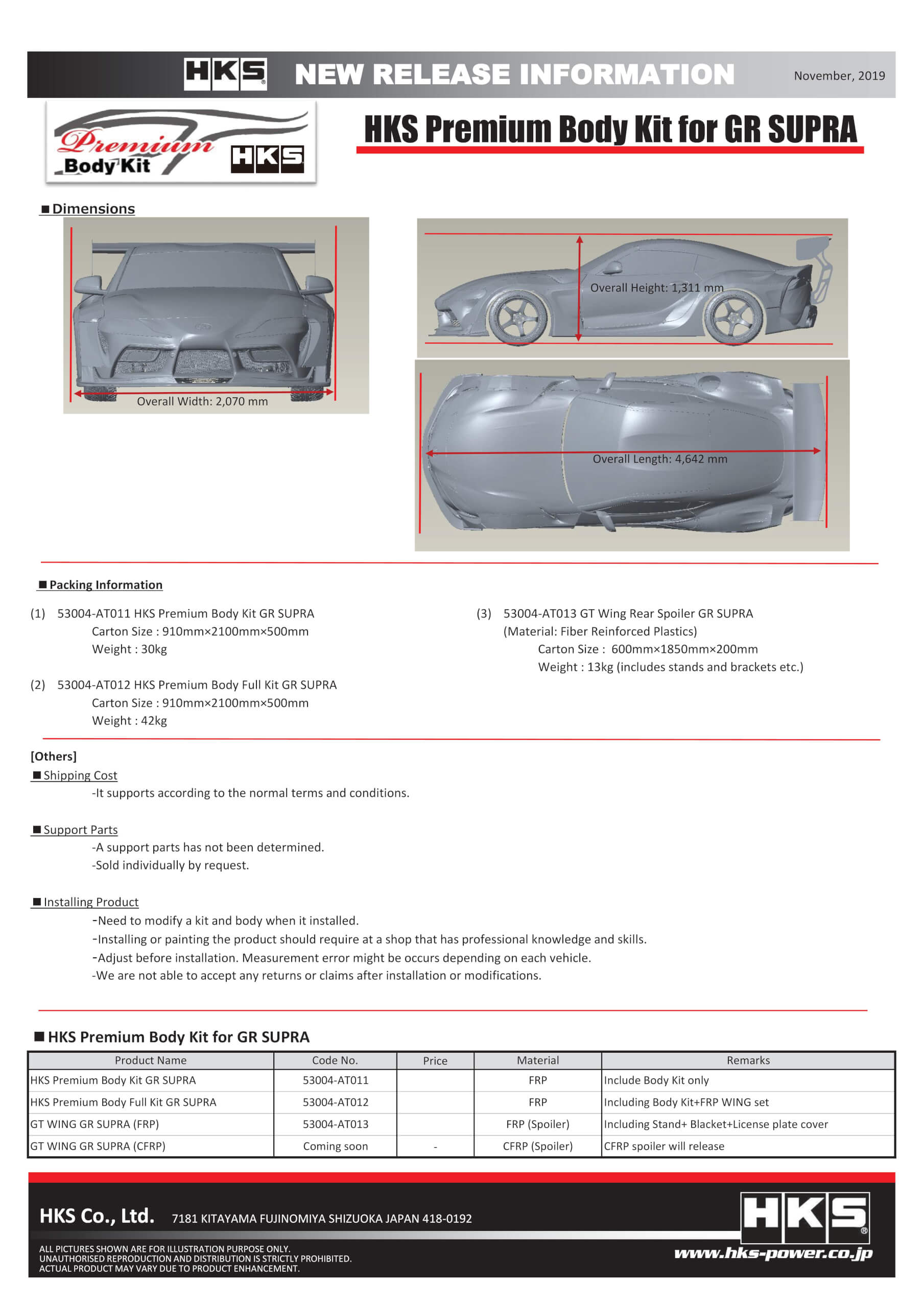The continued involvement of HKS in motorsports has provided them with constant data and knowledge which have been utilized in the development of new aeromotive products. The wide body kit for the 2020 Supra is the first of the original aero kits by HKS. HKS time attack machines such as the "CT230R", "TRB 03" and "TRB 04" were used to research, analyze and develop the ideal aerodynamic body kit.