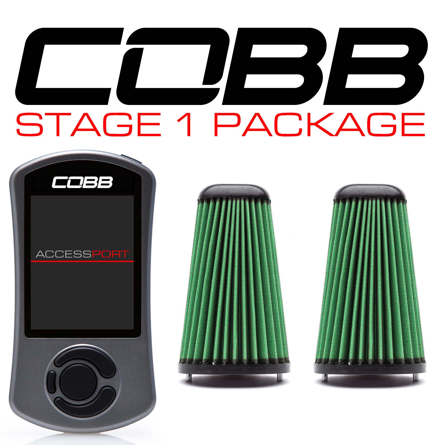 The Stage 1 Power Package includes the COBB Accessport and High Flow Filter.