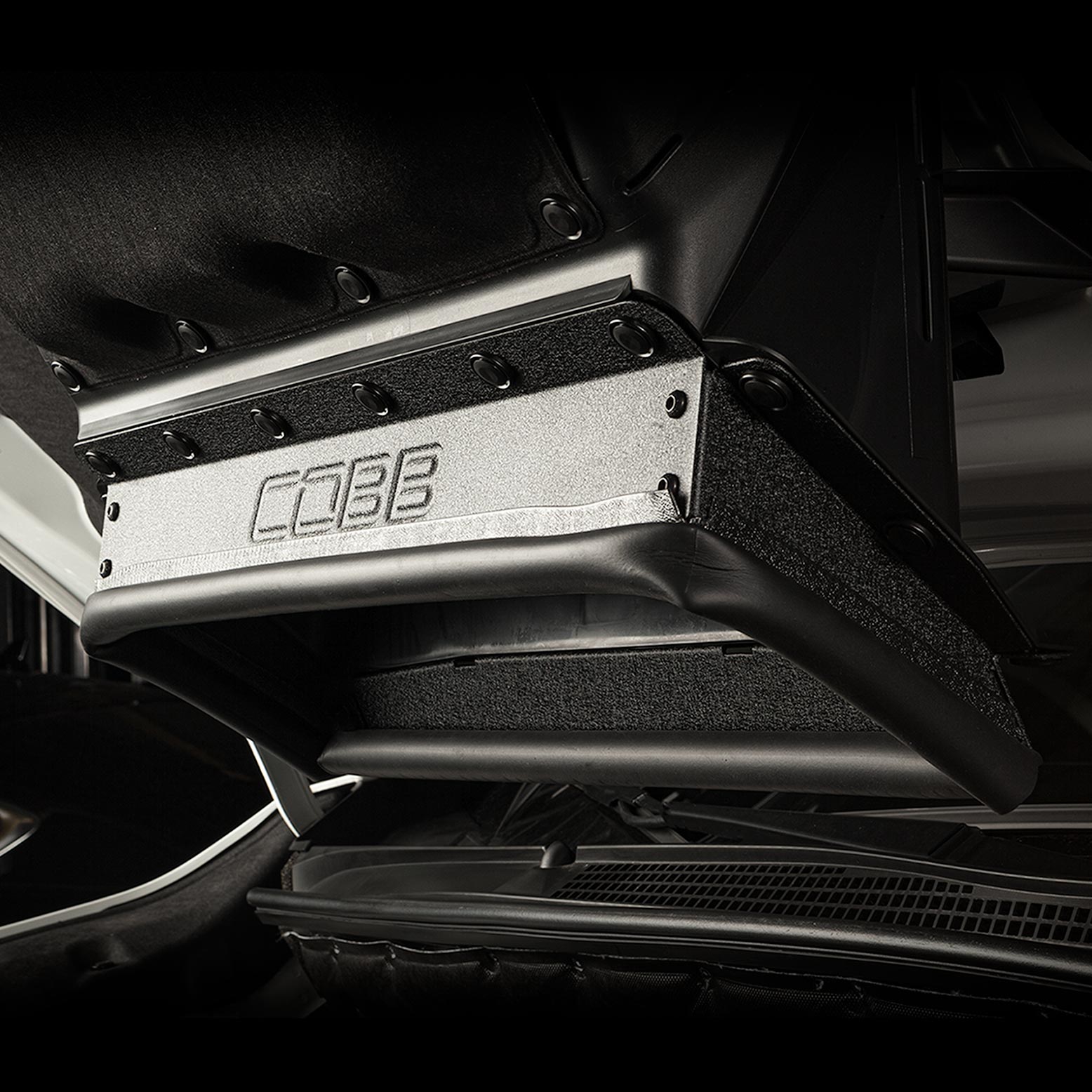 The included COBB Thrust Tunnel is constructed of wrinkle black powder coated aluminum and attaches to the factory hood ducting to maximize airflow through the core.